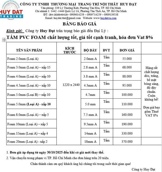 4. Bảng giá tấm nhựa Foam PVC mới nhất [2025] – cập nhật chi tiết từng độ dày